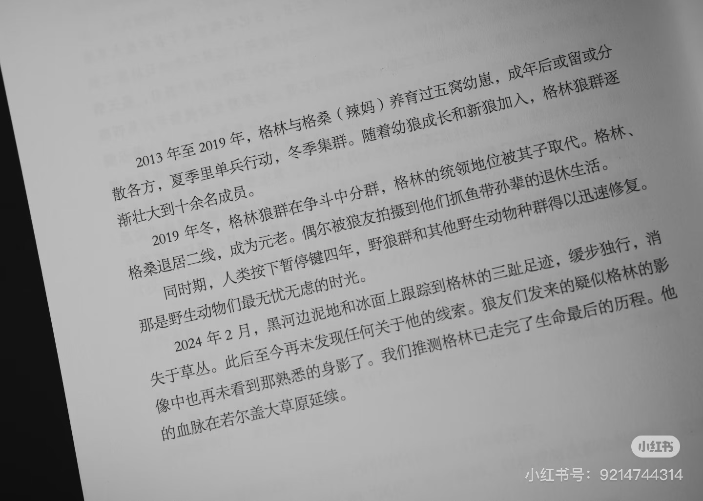 今年2月,由三环出版社再版的《重返狼群》,增添了格林一家的最新消息:“2024年2月,黑河边泥地和冰面上跟踪到格林的三趾足迹,缓步独行,消失于草丛。此后再未发现任何关于它的线索。狼友们发来的疑似影像中也再未看到那熟悉的身影。我们推测格林已经走完了生命最后的历程,他的血脉在若尔盖大草原延续。”如果按照最后发现格林足迹的2024年算,格林活到了14岁。