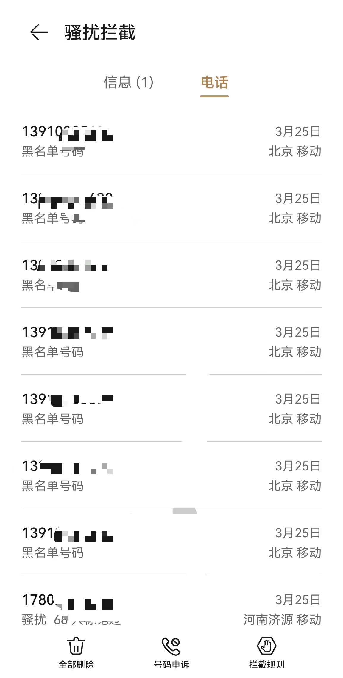 “我的电话都被打爆了!”3月30日,导演亦风告诉封面新闻记者,“这些骚扰电话接起来都是恐吓、辱骂之类的话,我现在陌生电话一律不接。”他向记者发来一张手机通讯录“黑名单”截图,其中显示仅3月25日这天,就有八个电话被他拉黑,这还只是当天的部分电话。