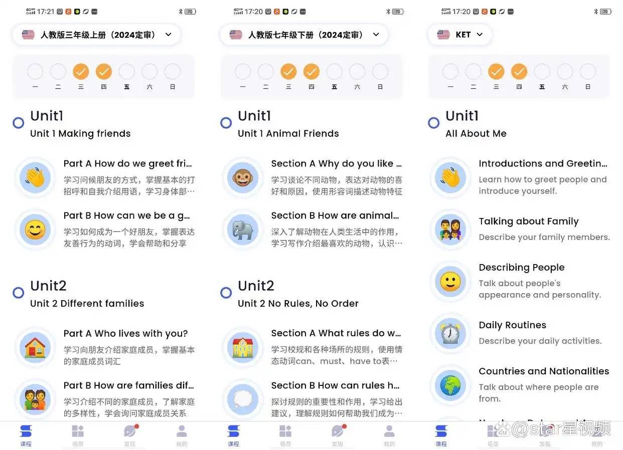 其界面设计充满年轻化元素,通过短视频、动画剧本配音的方式进行学习,趣味性十足,能够有效激发低龄儿童的学习兴趣。